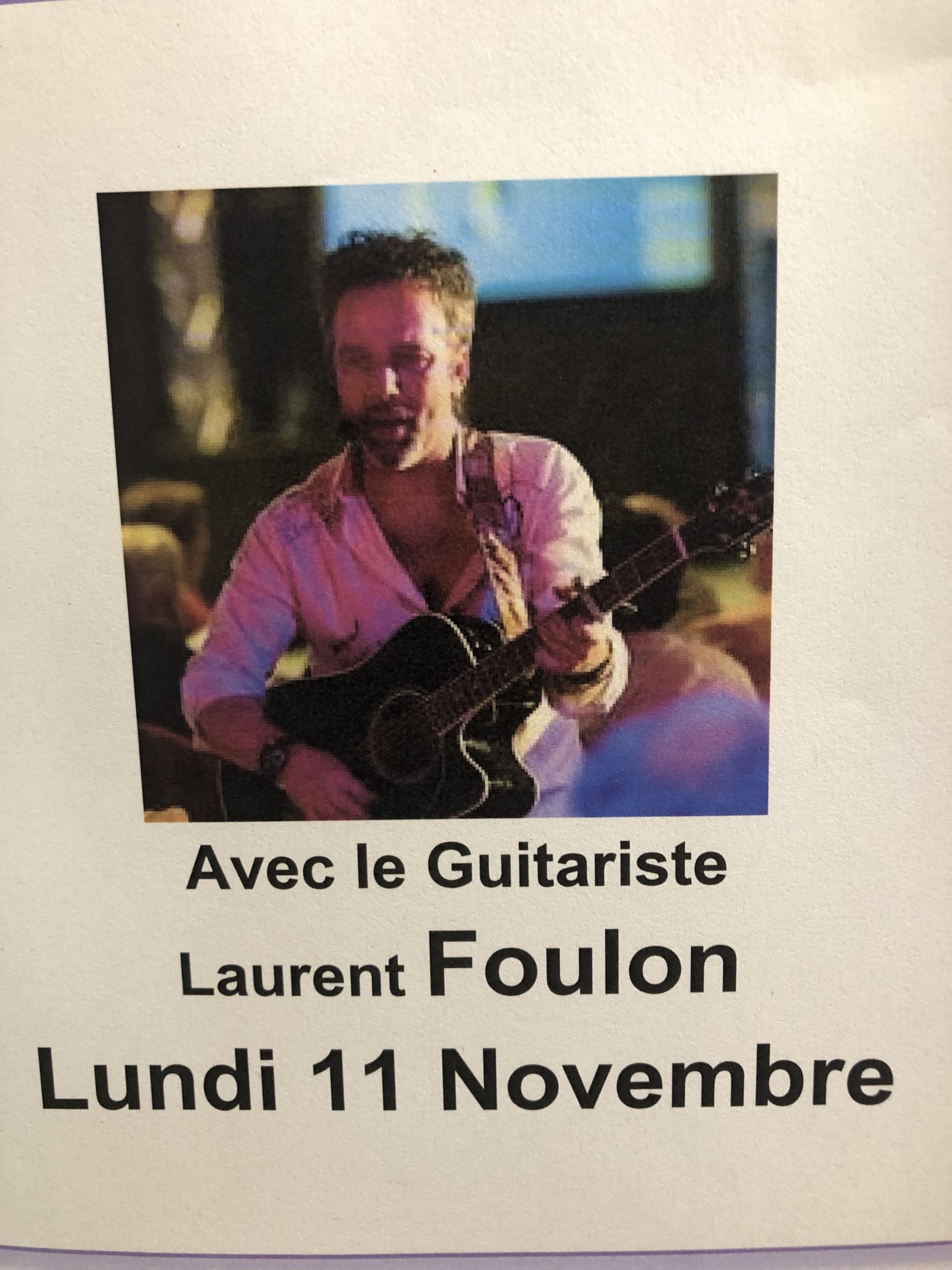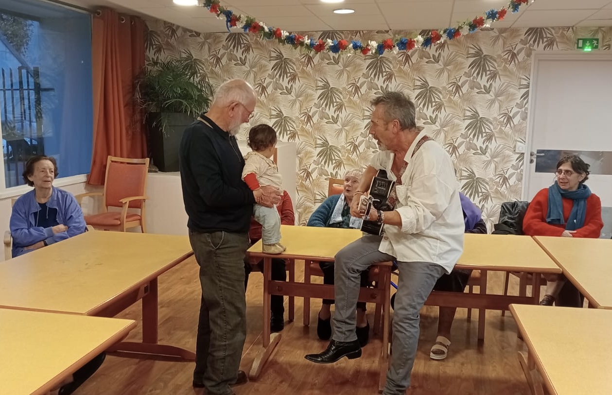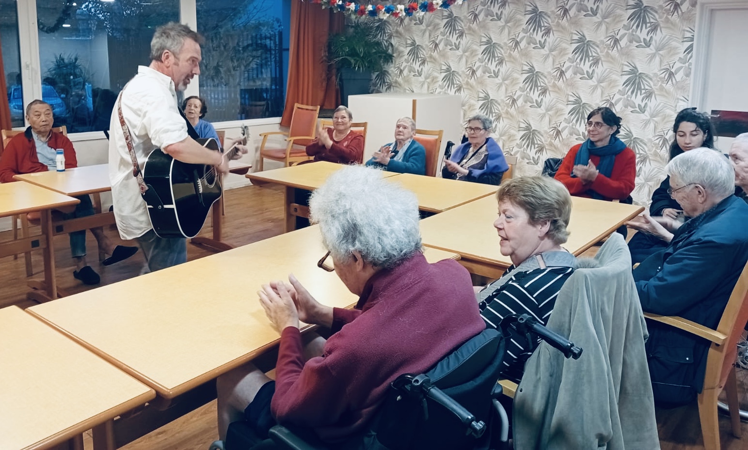 Après le goûter, ceux qui le désiraient avaient rendez-vous avec ma guitare dans la salle de restauration/bar . Ils sont venus assez nombreux. Certains, jour férié oblige, avaient de la visite en chambre, d’autres étaient de sortie, donc absents pour chanter avec moi. Je pense notamment à Mohammed, Anne-Marie, Christiane, Victoria…