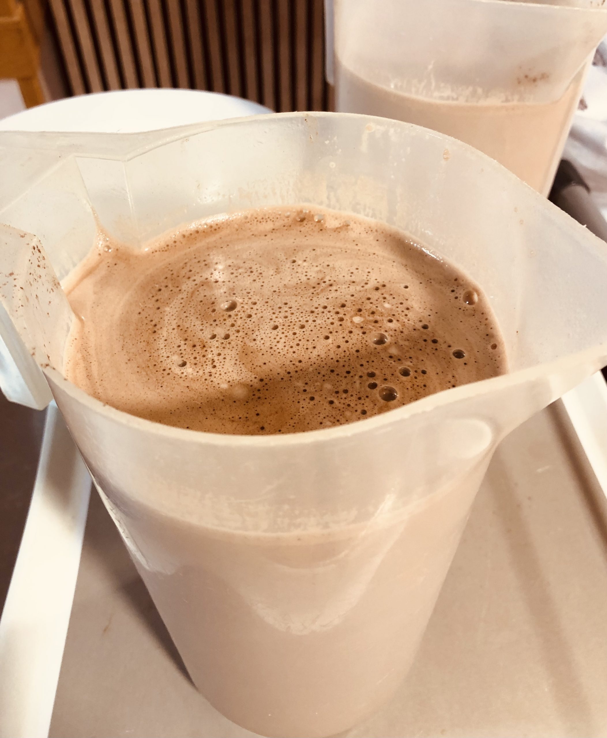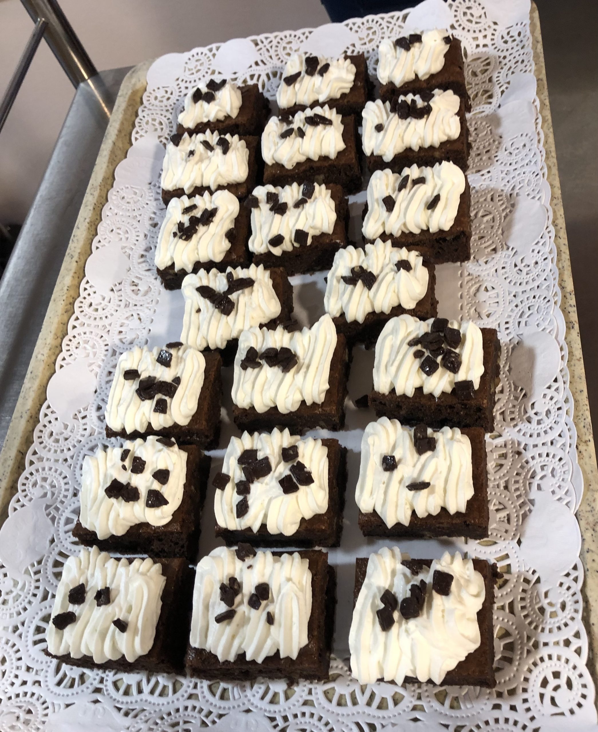 Le goûter du jour – Brownies et chocolat chaud – était servi dans la grande salle de restauration.