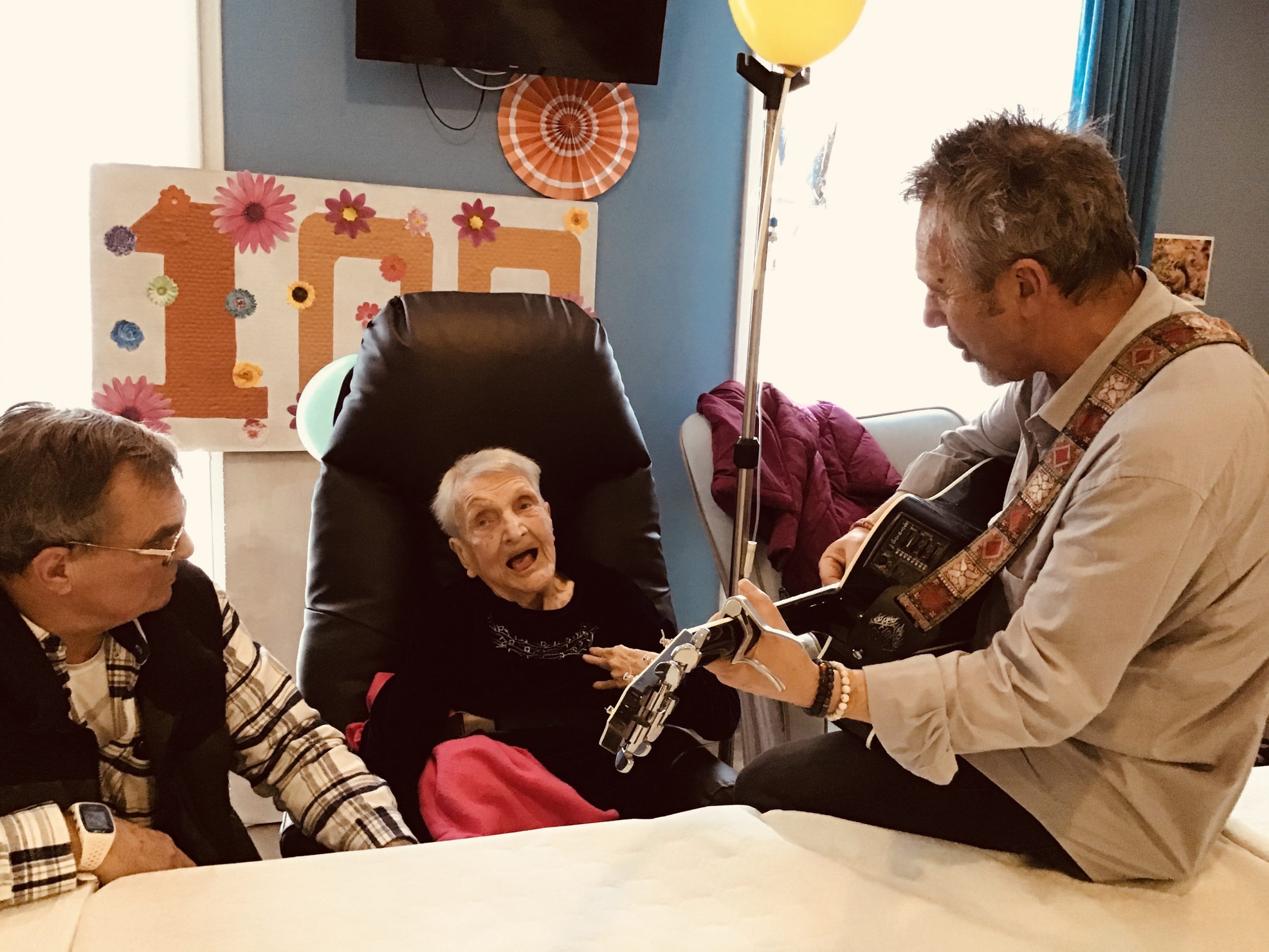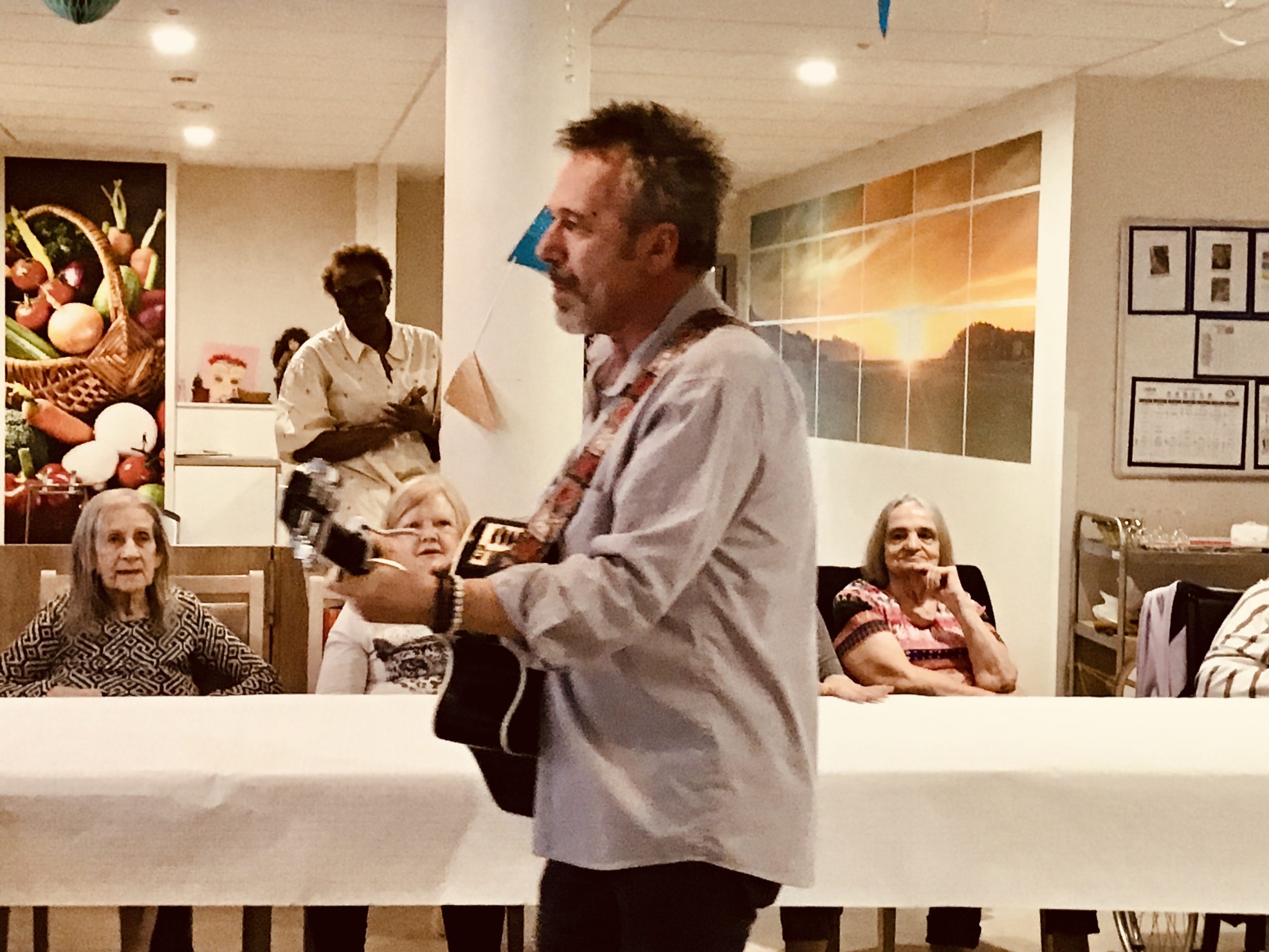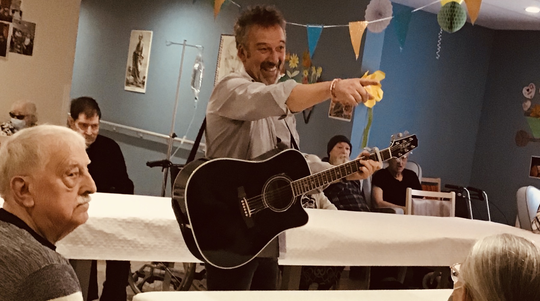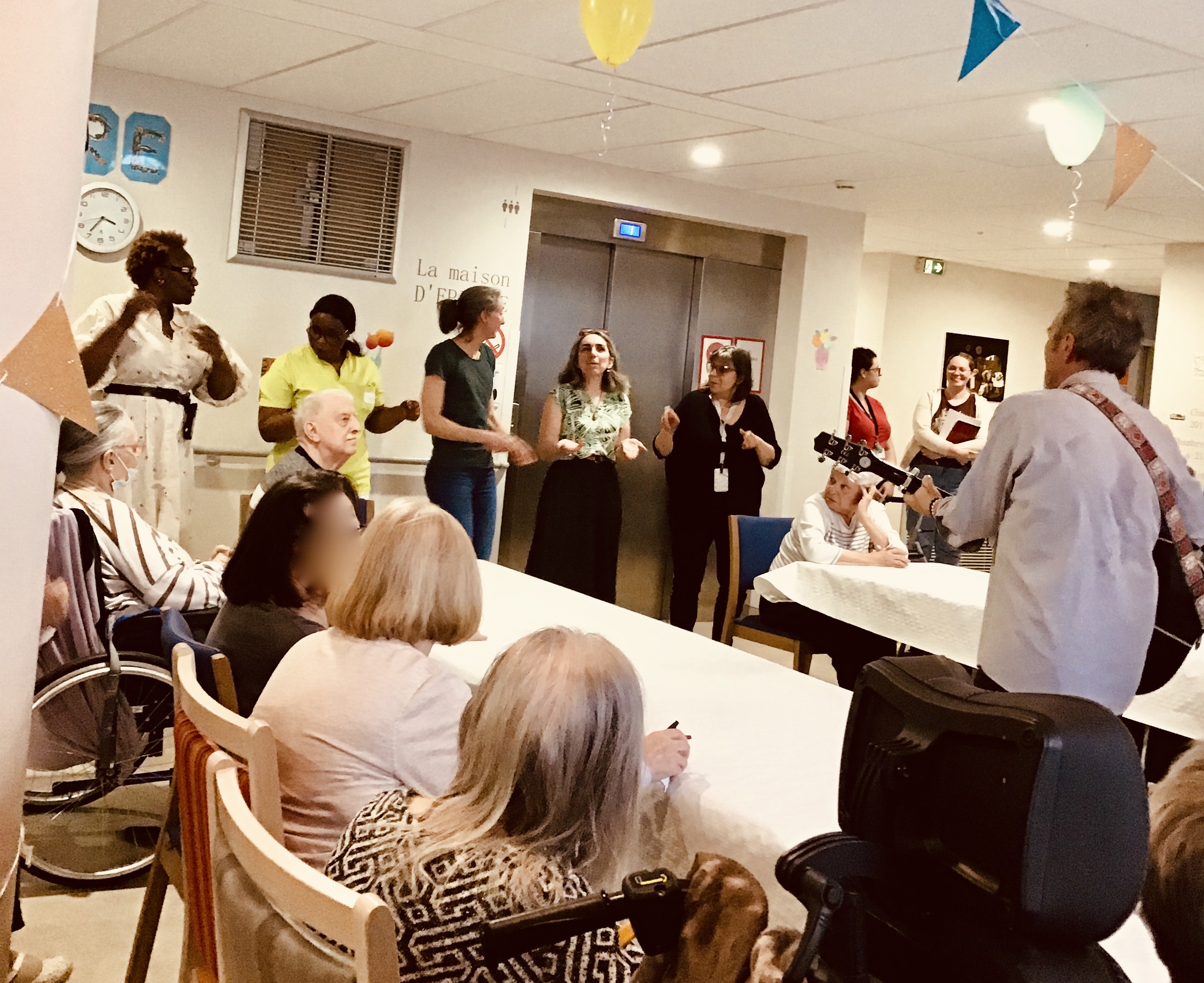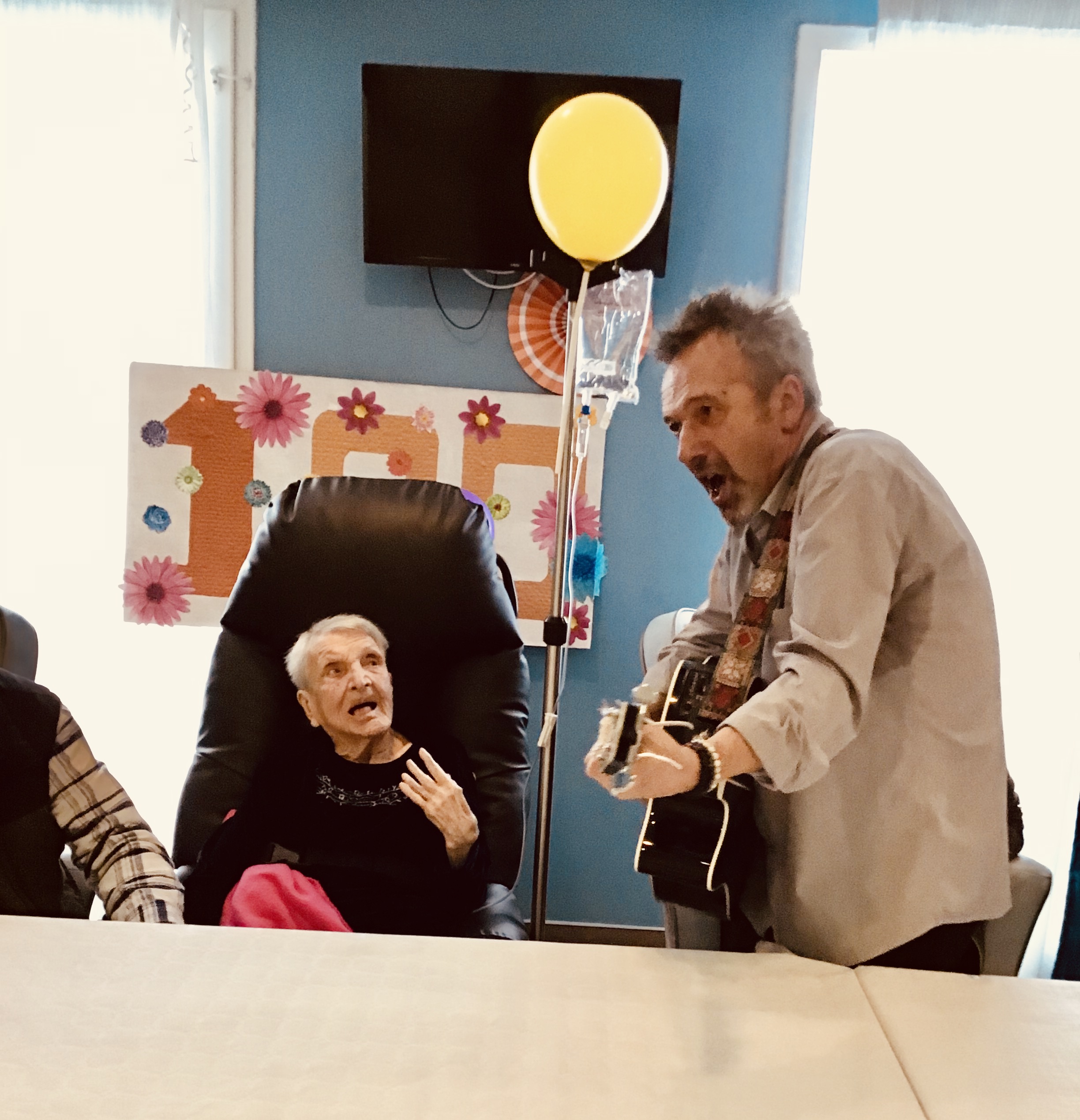 Les soignantes, animatrices et agents de service en place n’ont pas été avares de leurs voix et ont donné beaucoup en tapant dans les mains et pour certaines en se trémoussant au rythme de ma guitare. Un grand merci à Nadège, Samira et les autres.