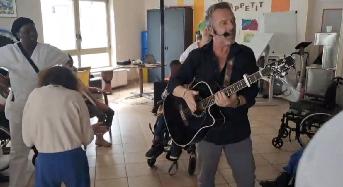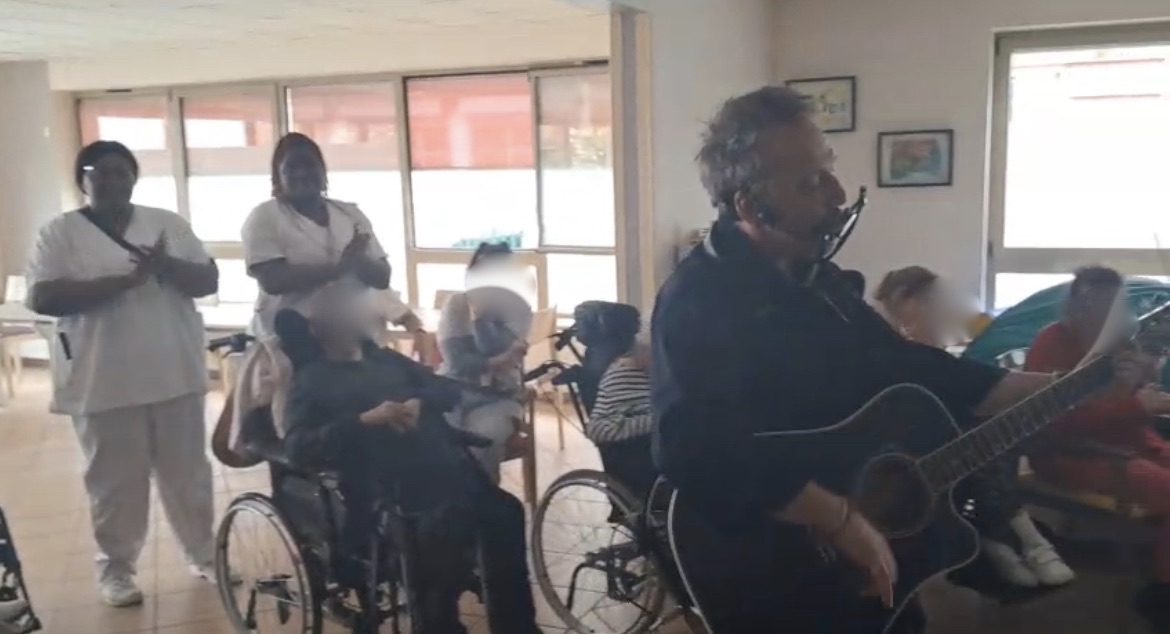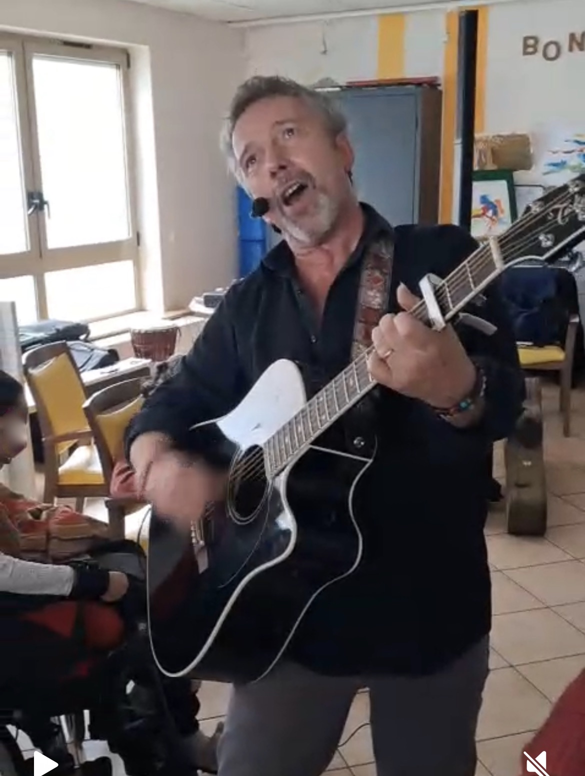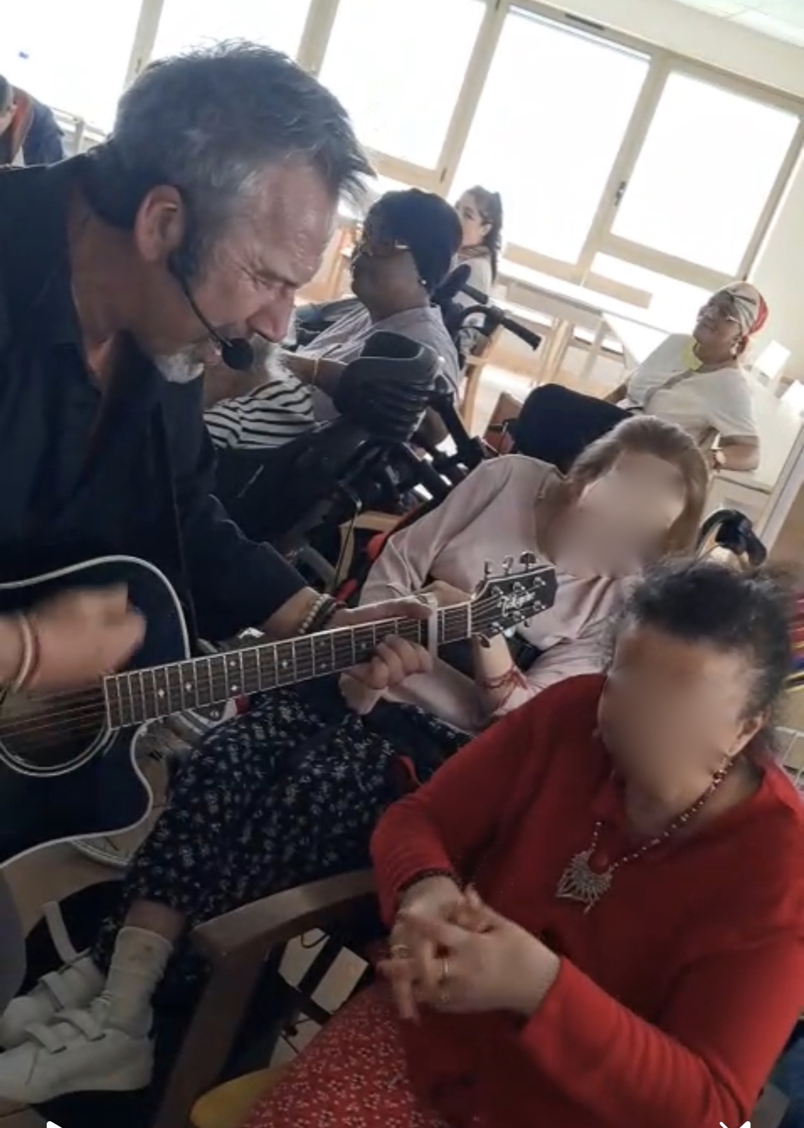 En fin d’animation j’ai fait essayer ma guitare à beaucoup de résidents. L’approche de l’instrument est une chose surprenante et pas simple pour eux. J’ai lu beaucoup d’émerveillement dans leurs yeux au moment où ils ont touché les cordes et que ça a fait un joli son. Je le ferai systématiquement quand j’irai les voir.