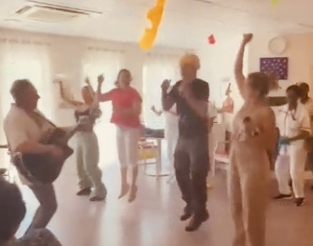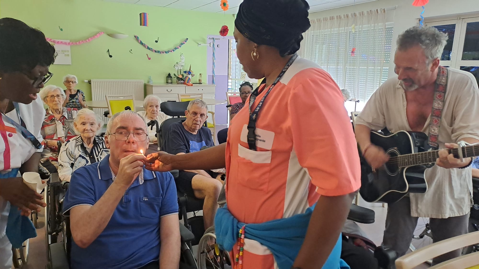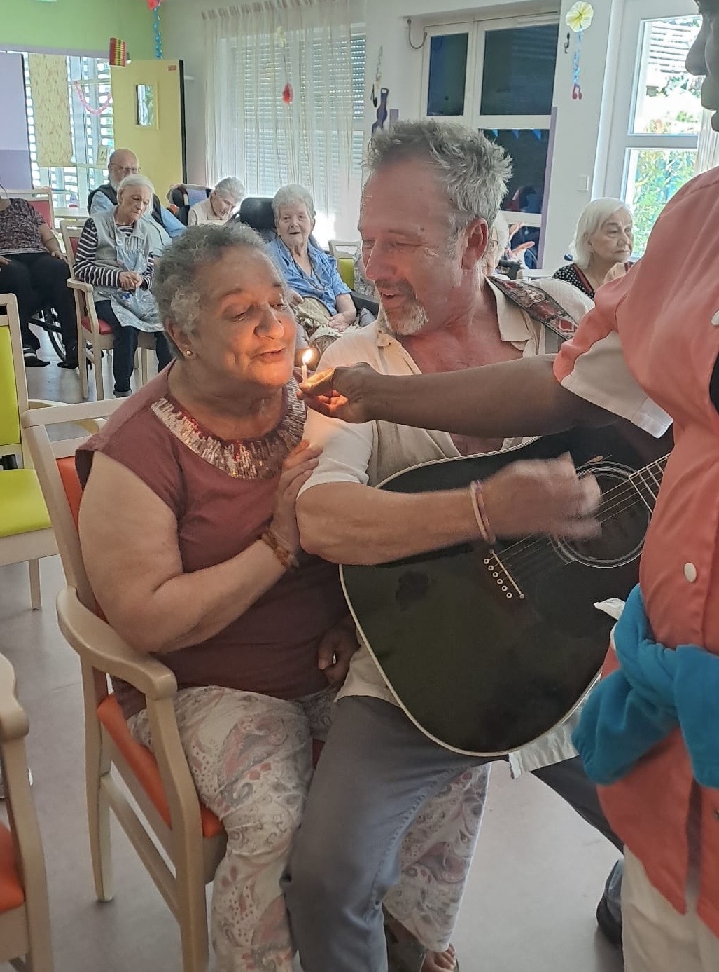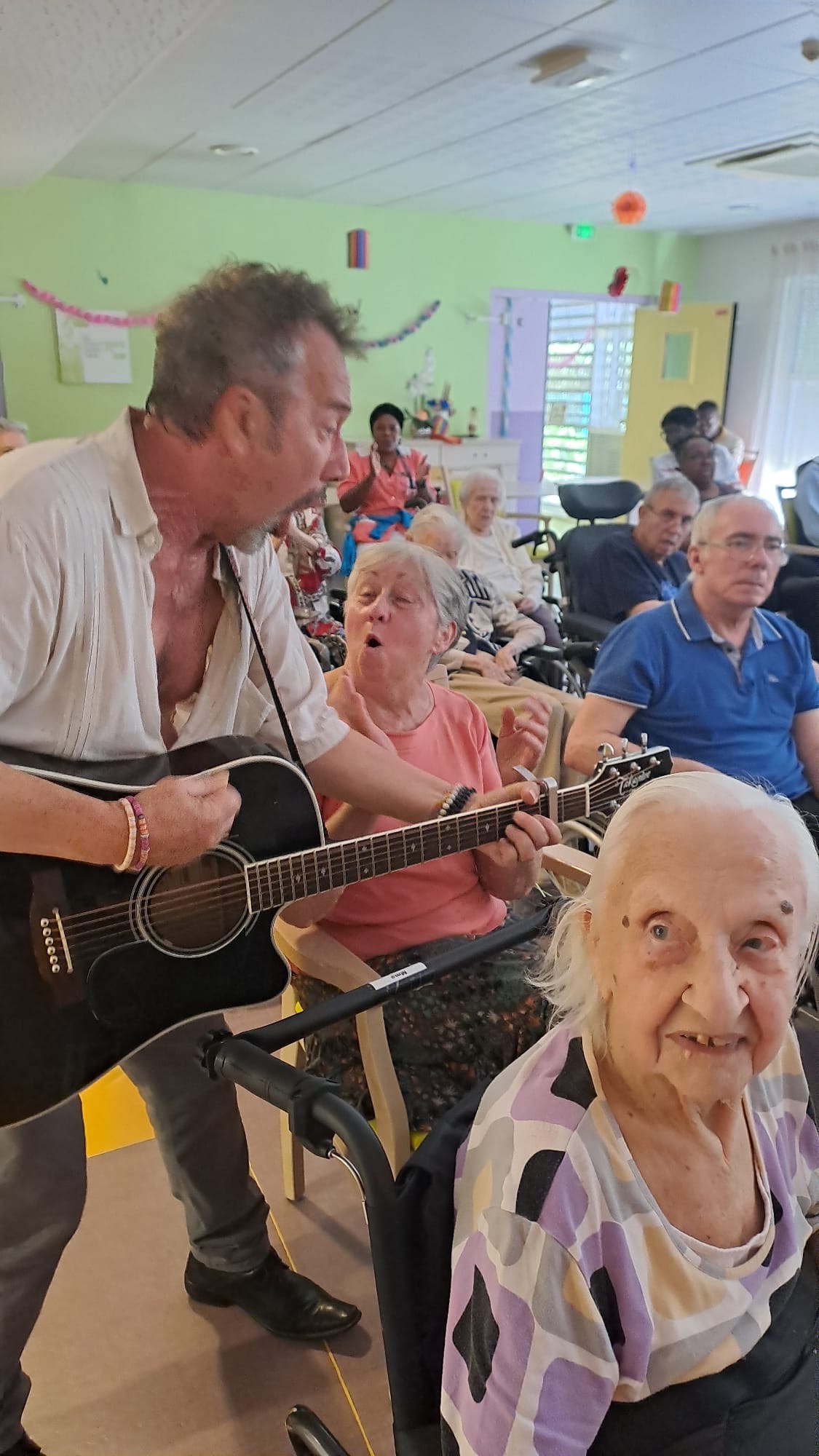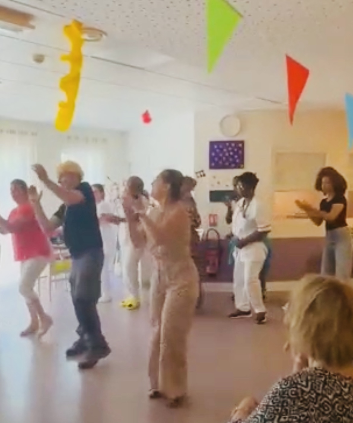Le moment venu, l’ami Christophe ne s’est pas fait prier pour participer. Il a même accepté une perruque amenée par Nelly … Vraiment sympa Christophe sachant que la perruque en question était plutôt celle de Bozo le clown que de Claude François. Il s’est très bien débrouillé pour suivre la difficile chorégraphie créée par Nelly et Célia (Infirmière). Tout les joyeux participants ont été au top et nous nous sommes bien marrés. Les résidents aussi.
