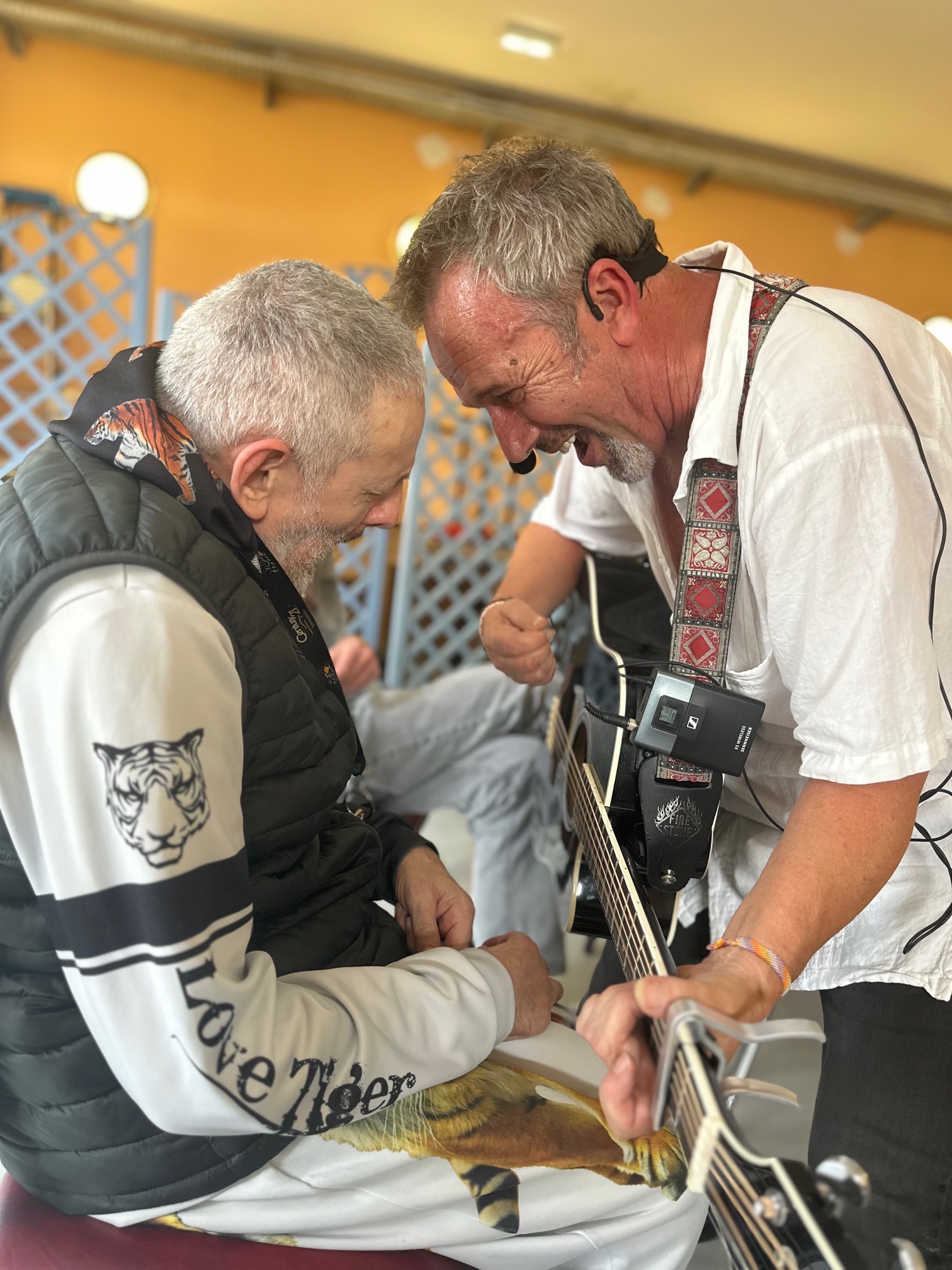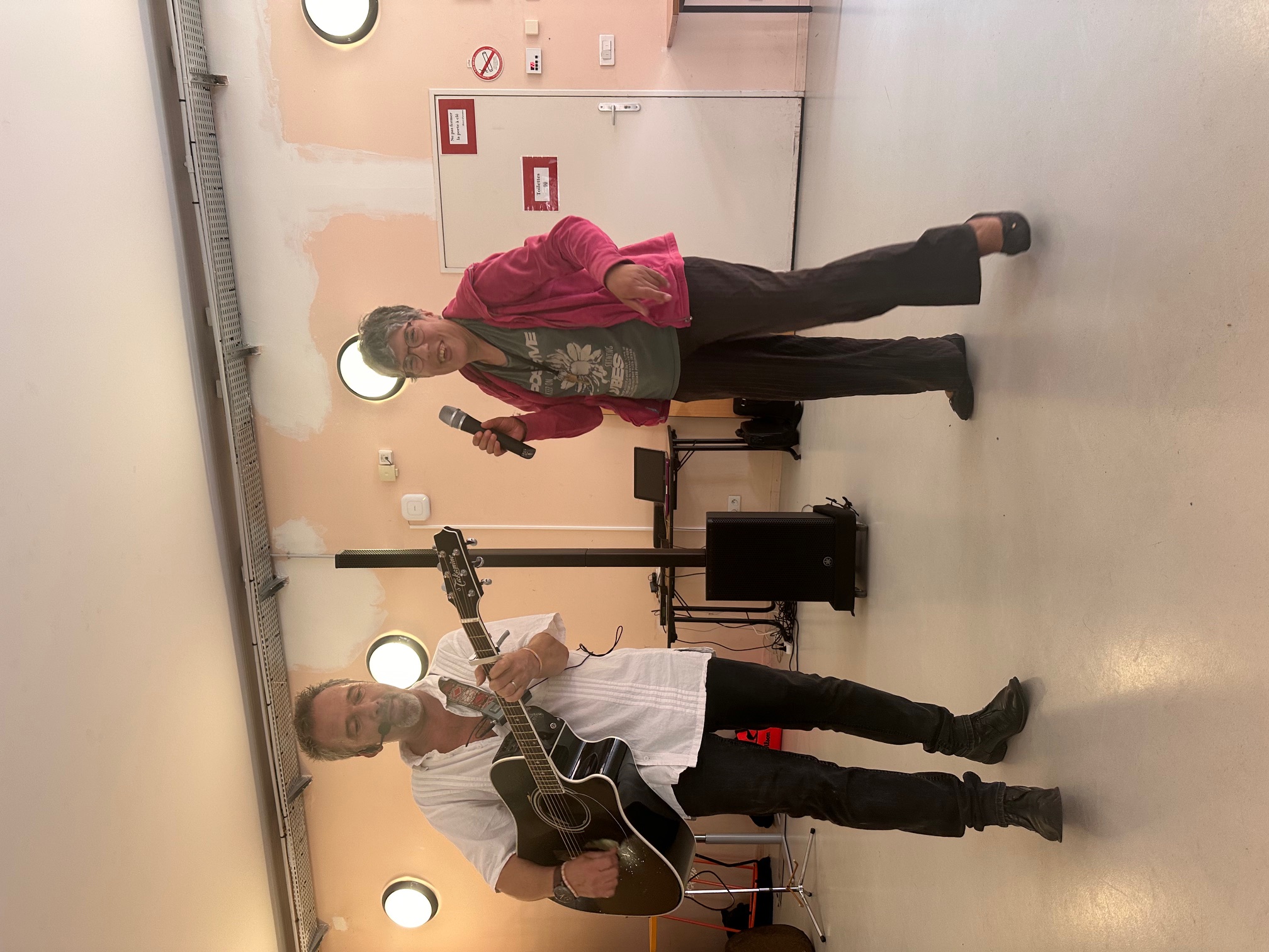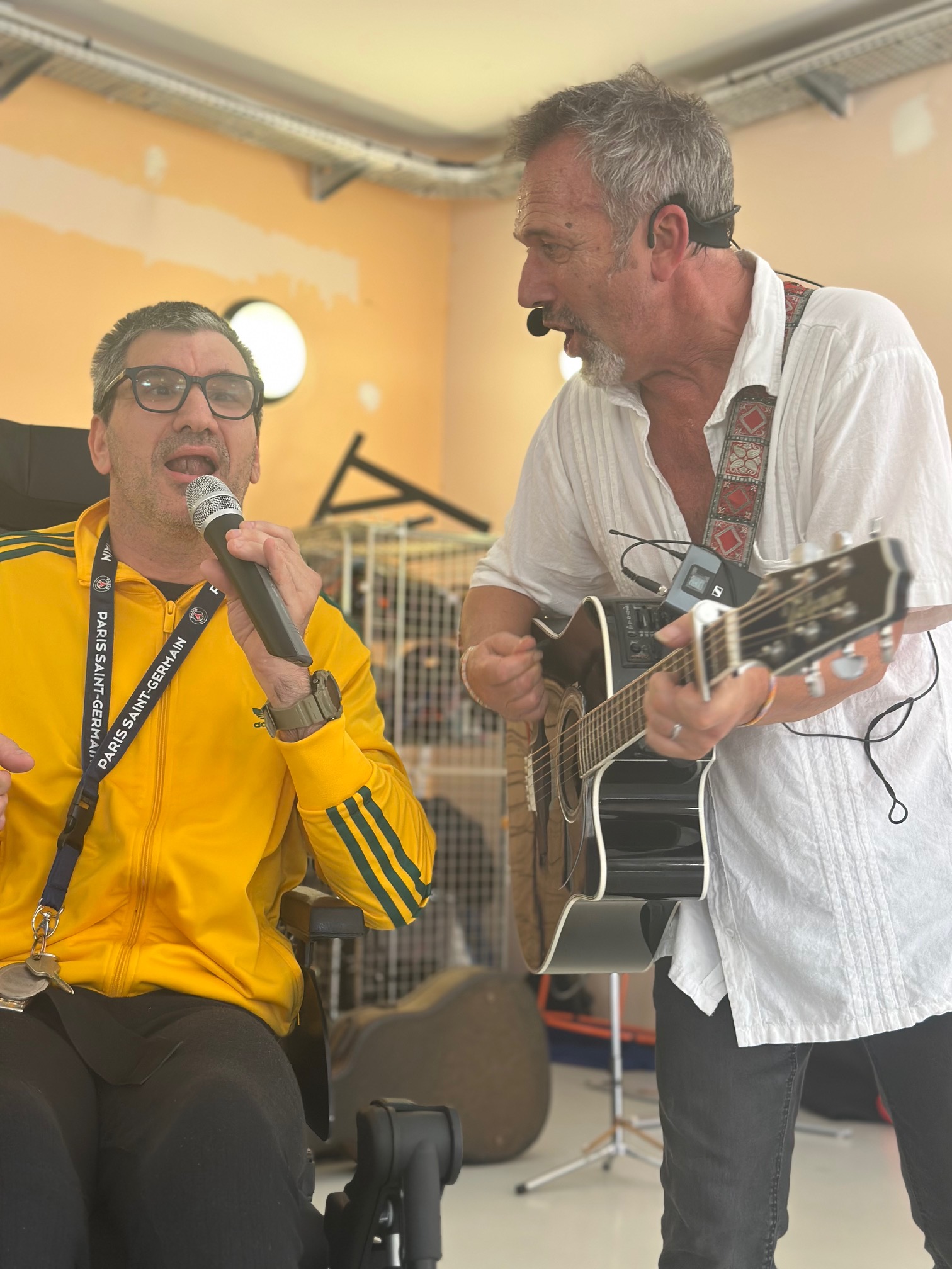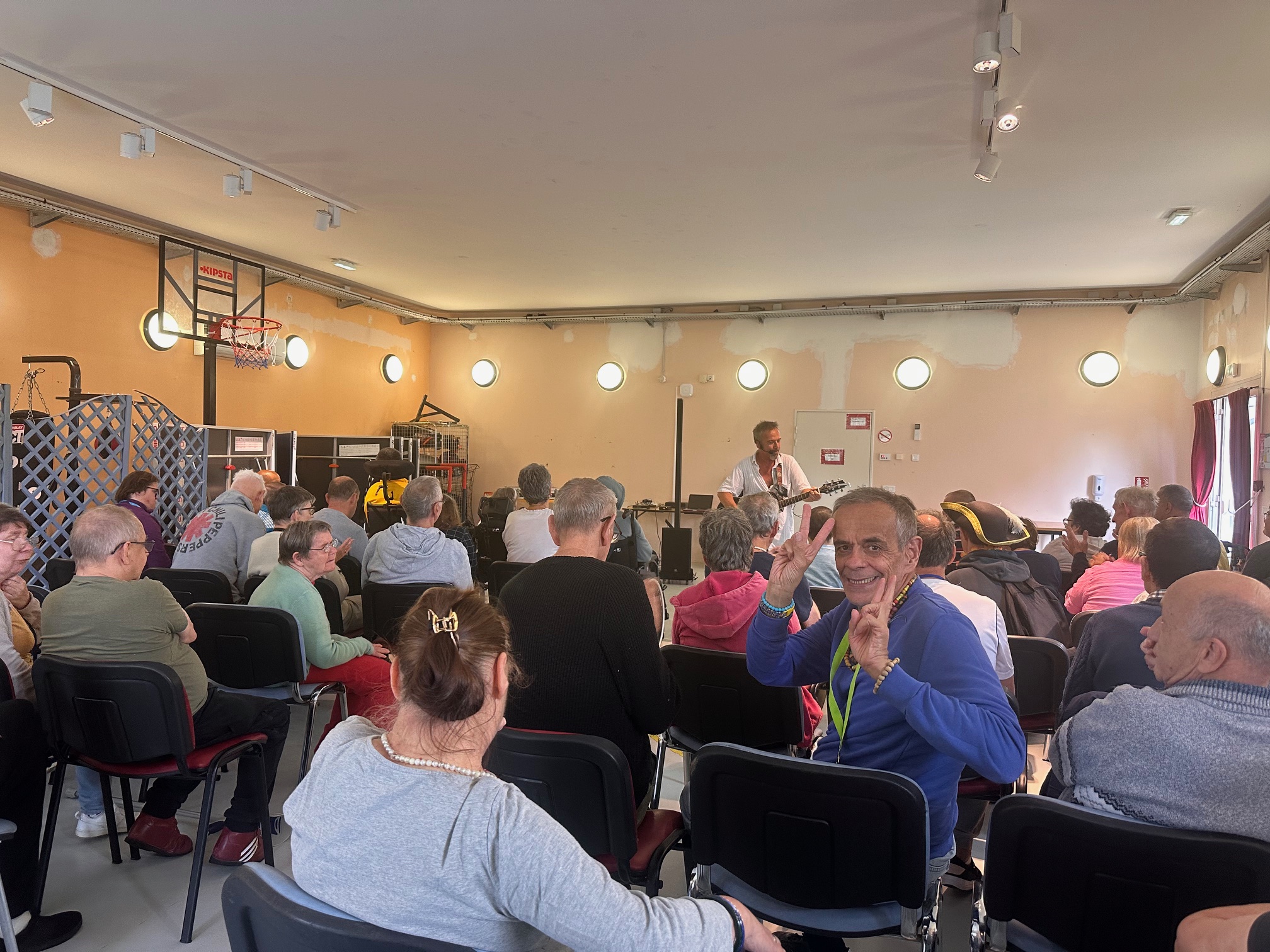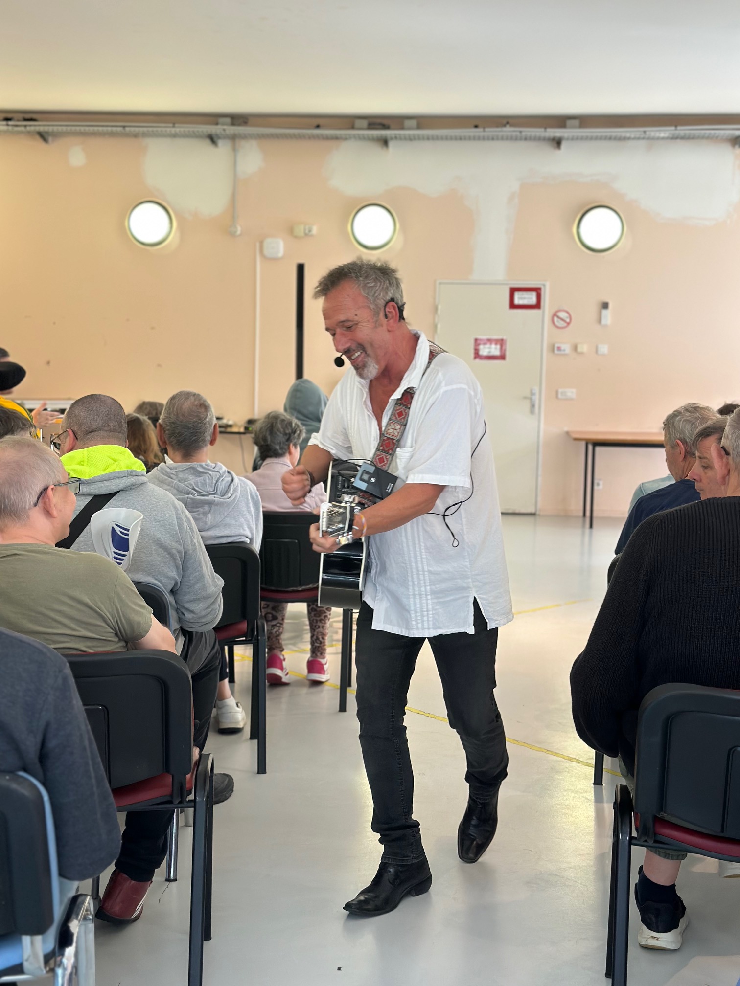 Après le déjeuner le file dans la salle polyvalente pour installer ma sono et faire quelques essais de sons. Karine – une des deux responsables du pôle activités – m’accompagne, elle installe la salle façon « public de théâtre » et laisse une large place pour danser. Pour installer la salle, Karine est toujours aidée par un ou deux résidents. Cette fois-ci c’est Denis qui nous a filé un coup de main. Denis, résident en externat, musicien à ses heures perdues (accordéon) a un excellent sens du rythme et une oreille « harmonique » très développée. Il avait joué avec moi lors de la fête d’anniversaire de notre ami Christophe en mars dernier. Un bien joli souvenir :