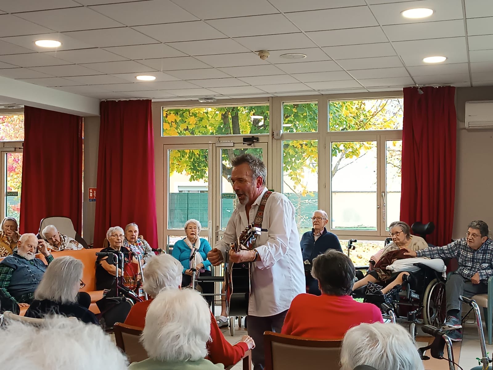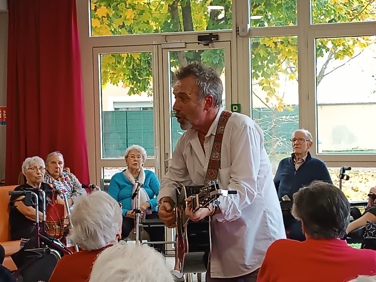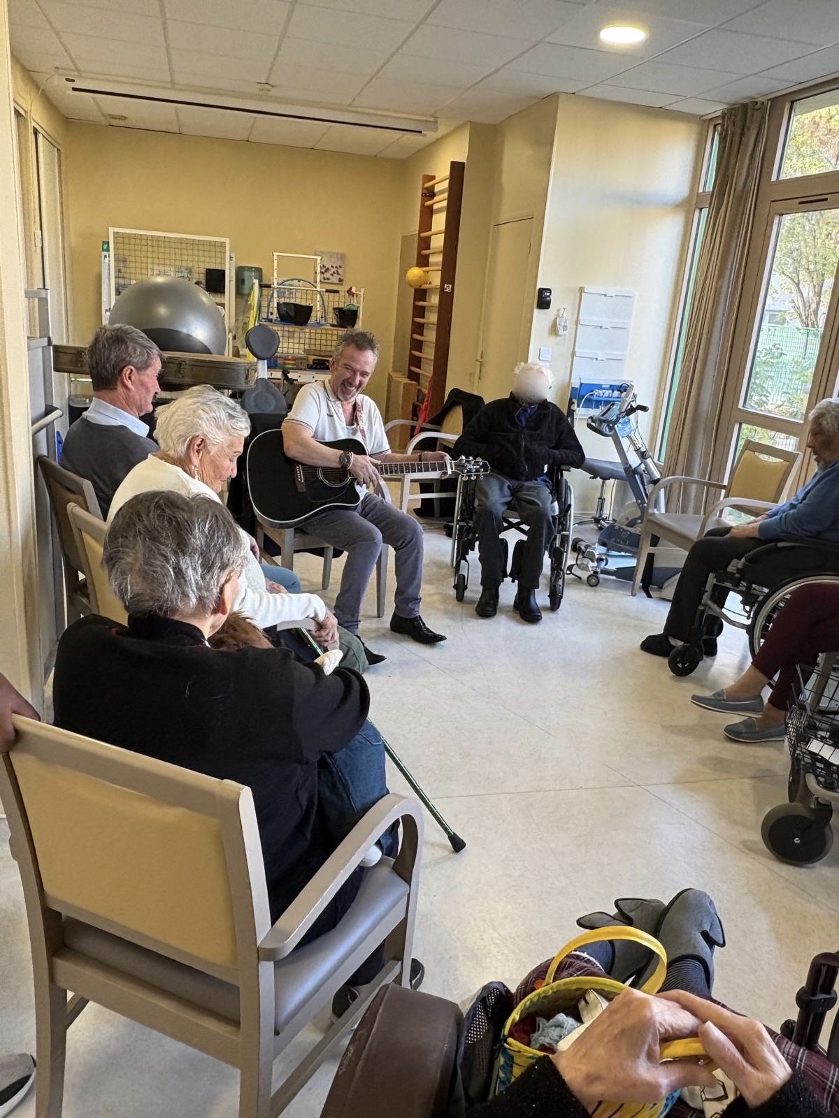 Après l’animation , ils ont pris un bon goûter, j’ai pris un verre de jus de raisin en papotant avec eux puis j’ai ressorti la guitare pour quelques morceaux en concert très privé . Des chansons d’Elvis pour Denise (à défaut de pouvoir jouer les chansons de Michael Jackson qu’elle me demandait). Chez Laurette pour Roberte et du Cabrel pour la fille d’Yvon.